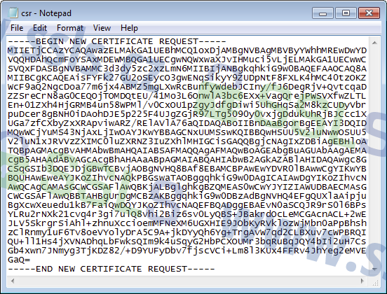 Vyhledejte vytvořený textový soubor s CSR žádostí a otevřete jej v programu Notepad (Poznámkový blok). CSR žádost vypadá zhruba takto: