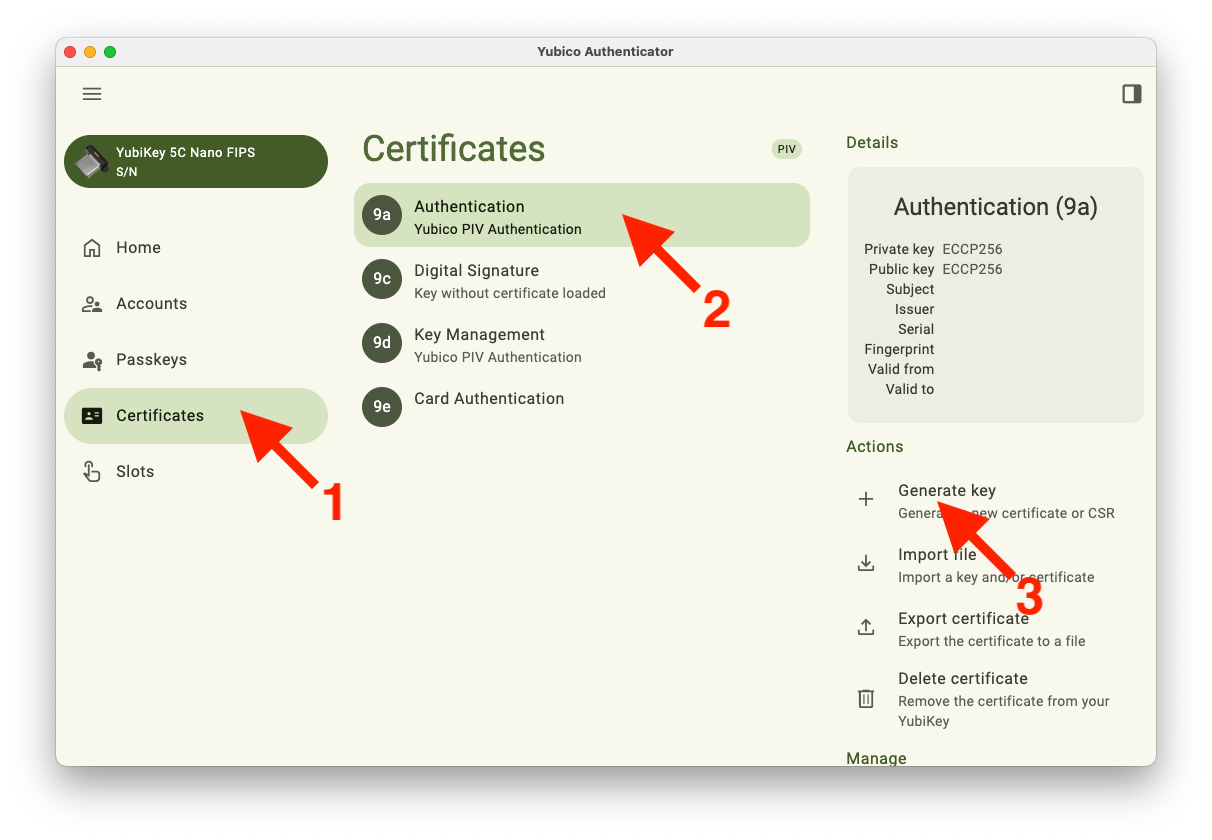 Otevřete aplikaci Yubico Authenticator, v levém menu vyberte Certificates, uprostřed klikněte na 9a Authentication a vpravo pak klikněte na + Generate Key.