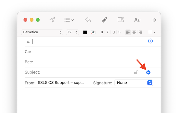 Poznámka: Pokud již máte veřejný klíč tohoto kontaktu (k tomu v Mailu dojde automaticky v momentě přijetí e-mailu opatřeného digitálním podpisem od daného kontaktu), budete moci aktivovat i vedlejší ikonku visacího zámku, která symbolizuje šifrování.