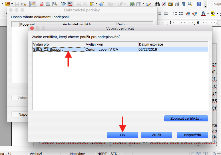 - Certifikát se nyní zobrazí v seznamu. Uložte kliknutím na tlačítko OK. Pokud mezitím byl spuštěn OpenOffice, je nutné ho restartovat.