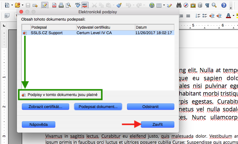 Zpět v okně Elektronické podpisy nyní uvidíte váš podpis a informaci, že je podpis platný. Okno nyní můžete zavřít kliknutím na tlačítko Zavřít