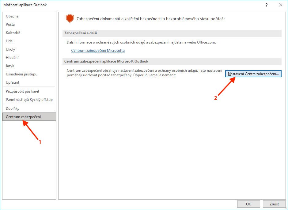 V levo vyberte sekci Centrum zabezpečení a poté klikněte na tlačítko Nastavení Centra zabezpečení….