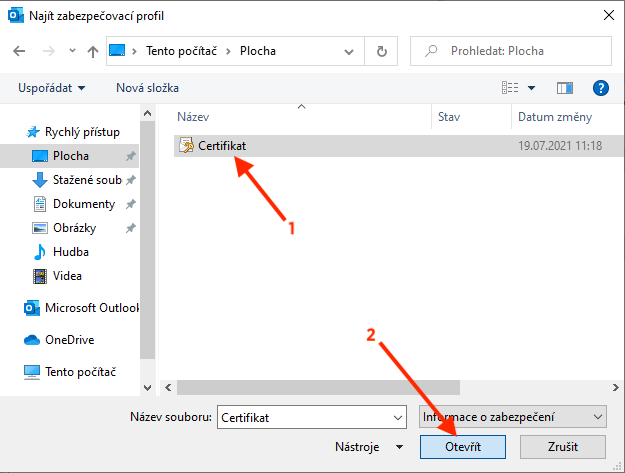 Procházením najděte soubor staženého certifikátu, vyberte ho kliknutím a poté klikněte na tlačítko Otevřít.