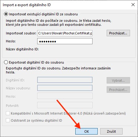 Zaškrtněte volbu Importovat existující digitální ID ze souboru, zadejte Heslo k certifikátu a poté klikněte na tlačítko Procházet….