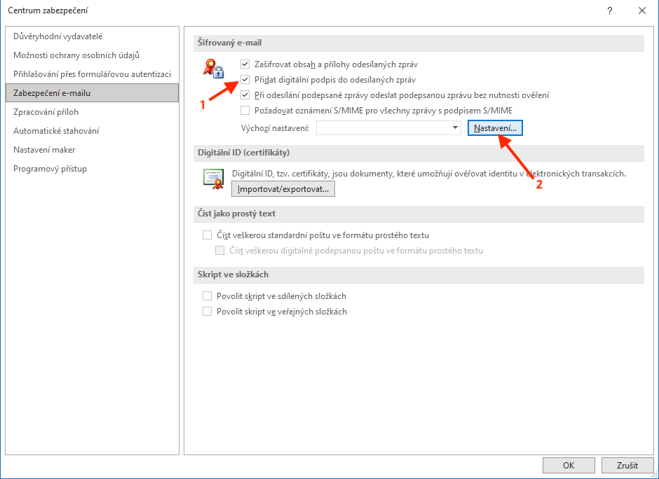 Tuto část provedete pouze jednou. Poté již budete moci kdykoliv pohodlně digitálně podepisovat či šifrovat e-maily podle návodu níže v sekci Digitální podpis e-mailu.