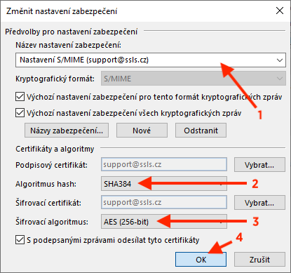 V rozbalovacím menu vyberte před momentem importovaný certifikát, Algoritmus hash zvolte SHA384, Šifrovací algoritmus zvolte AES (256-bit). Potvrďte kliknutím na tlačítko OK.
