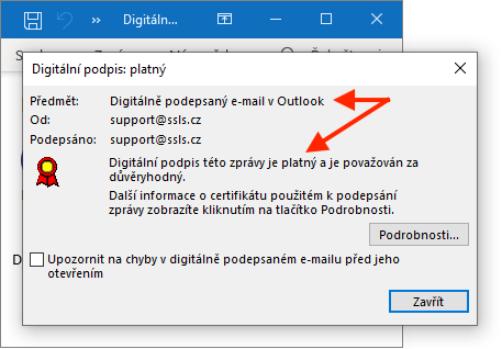 Pokud adresát také používá Outlook, pak v e-mailu uvidí pečeť digitálního podpisu:
