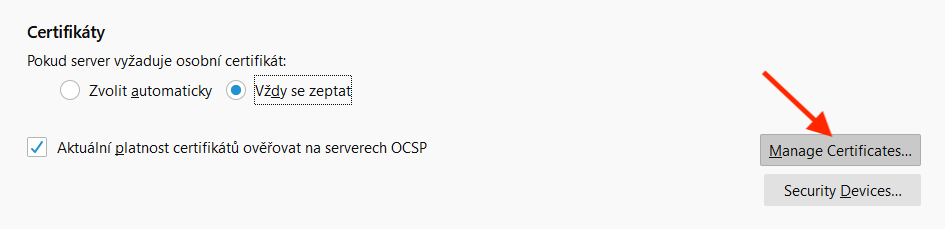 V sekci s nadpisem Certifikáty klikněte na tlačítko Manage Certificates….