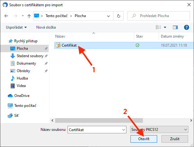 Procházením najděte soubor staženého certifikátu, vyberte ho kliknutím a poté klikněte na tlačítko Otevřít.