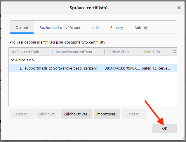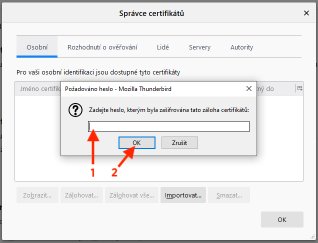 Zadejte heslo k certifikátu a potvrďte kliknutím na tlačítko OK.