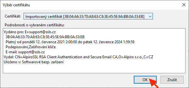 V rozbalovacím menu Certifikát zvolte příslušný certifikát a potvrďte kliknutím na tlačítko OK.