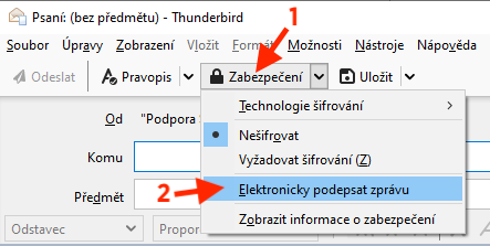 Před odesláním hotového e-mailu v horní liště klikněte na Zabezpečení a ujistěte se, že je zaškrtnutá volba Elektronicky podepsat zprávu. Pokud zaškrtnutá není, zaškrtněte ji kliknutím.