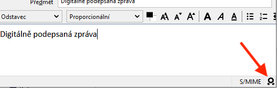 O tom, že bude e-mail odeslán opatřený digitálním podpisem, se můžete ujistit v pravém dolním rohu - pečeť s označením S/MIME: