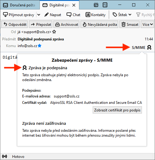 Pokud adresát také používá Thunderbird, pak v e-mailu uvidí pečeť digitálního podpisu.