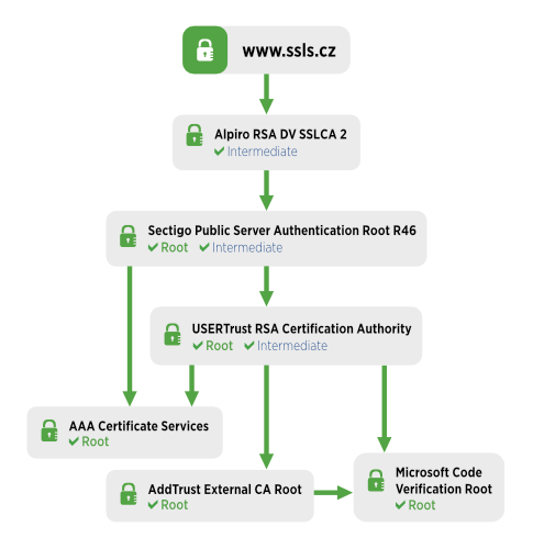 Server totiž předpokládá, že klient kořenový certifikát Sectigo Public Server Authentication Root R46 zná také, a tudíž ho bude považovat za důvěryhodný.
