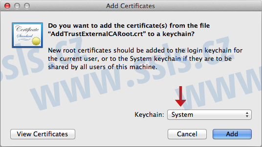 Pozor: Ujistěte se, že certifikáty ukládáte do System Keychain, nikoliv do Login Keychain — viz. obrázek: