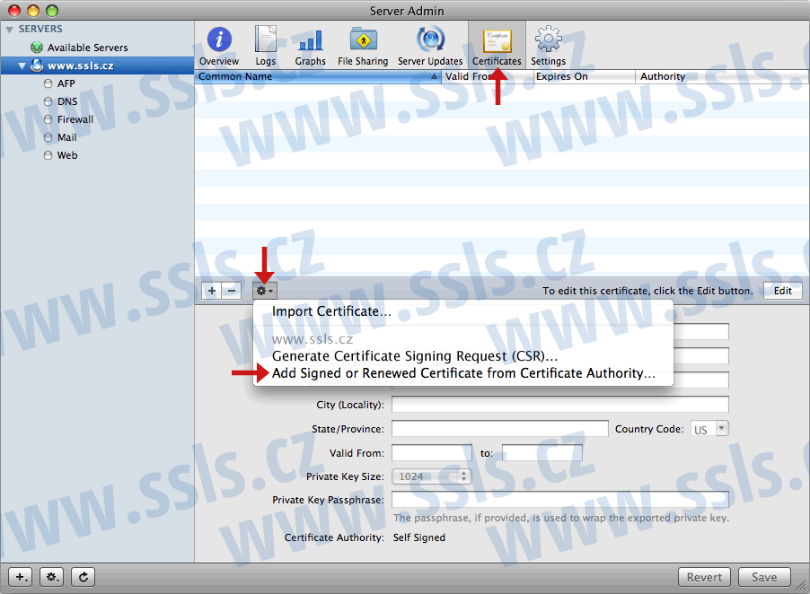 - Otevřete utilitu Server Admin a vyberte záložku Certificates.