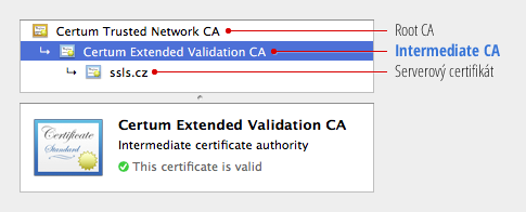 Intermediate certifikátem je podepsán váš (serverový) SSL certifikát. Na základě dědičnosti důvěry webový prohlížeč zjišťuje, zda byl SSL certifikát podepsán důvěryhodnou certifikační autoritou. Pokud podepisující certifikační autorita není důvěryhodná, zjišťuje prohlížeč, zda je důvěryhodná nadřazená certifikační autorita a takto postupuje, dokud nenajde důvěryhodnou kořenovou certifikační autoritu (Root CA).
