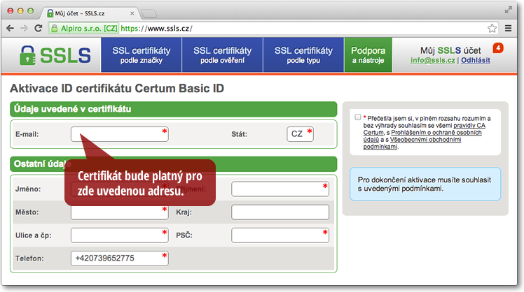 Ze všeho nejdříve je nutné vybrat vhodný certifikát, objednat jej a uhradit. Aktivaci lze provést až po přijetí platby za certifikát, což může být otázkou několika vteřin v případě platby kartou, ale i dnů v případě bankovního převodu. Čtěte více o akceptovaných platebních metodách.